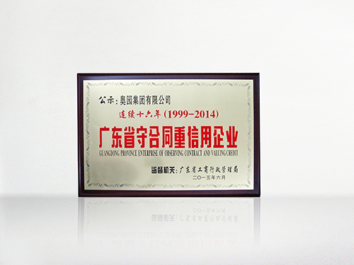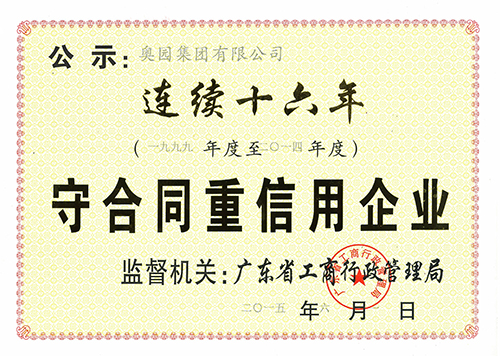 奧團(tuán)連續(xù)十六年榮膺“廣東省守合同重信用企業(yè)”稱號(hào)