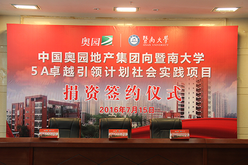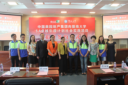(2016年7月15日——廣州)7月15日,中國奧園地產集團股份有限公司與暨南大學就該校“5A卓越引領計劃”優秀學生社會實踐項目正式簽訂合作協議,將由奧園提供必要支持協助暨南大學部分優秀學生參與社會實踐活動。這是奧園集團“2016奧園‘筑’夢”系列活動之一,是集團為推動青年成長成才、支持教育事業發展而積極承擔的社會責任。
