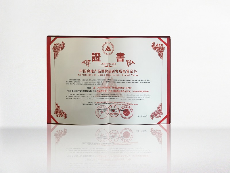奧園榮獲“2016中國房地產公司品牌價值TOP20”證書