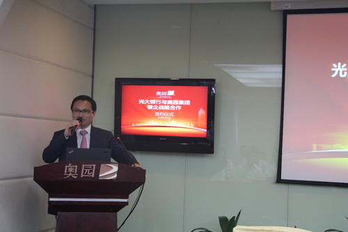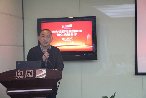 奧園集團(tuán)黨委書記、總裁郭梓寧先生致辭表示,奧園集團(tuán)在董事局的領(lǐng)導(dǎo)下,通過上下級員工團(tuán)結(jié)一心的不懈努力,不斷拓展海內(nèi)外項目、提升行業(yè)競爭力、創(chuàng)新營銷模式,在成立20年間取得了累累碩果。奧園集團(tuán)一直貫徹著審慎的財務(wù)管理,積極拓寬并保持多元化的境內(nèi)外融資渠道,把握市場時機,持續(xù)優(yōu)化債務(wù)結(jié)構(gòu),進(jìn)一步降低借貸成本。連續(xù)十六年榮膺“廣東省守合同重信用企業(yè)”稱號;連續(xù)十五年蟬聯(lián)四大國有金融機構(gòu)頒發(fā)的“廣東地產(chǎn)資信20強”稱號,2016年3月被國家權(quán)威機構(gòu)評定為“中國房企綜合實力30強”。今年先后與平安銀行簽訂100億元、江蘇銀行150億元的戰(zhàn)略合作協(xié)議,本次與光大銀行簽訂200億元授信額度是奧園集團(tuán)有史以來最大的一筆銀行授信,也印證了各大金融機構(gòu)對奧園集園的高度認(rèn)可和大力支持。最后,郭梓寧先生表達(dá)了對本次簽約儀式圓滿成功和雙方戰(zhàn)略合作的衷心祝愿以及未來強強聯(lián)合、攜手發(fā)展的高度憧憬。
