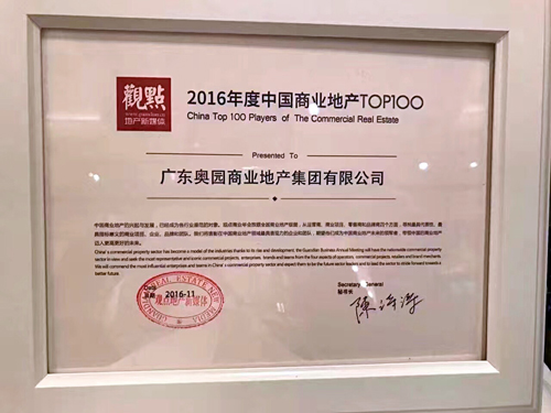 本次奧園商業地產集團獲得“中國商業地產100強”稱號,是對奧園商業地產集團在商業運營管理領域的專業水準的再一次肯定,也是奧園商業綜合實力的體現。