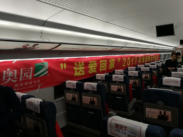 奧園推出的“奧園愛心專席”,專門向“精準扶貧對象”、“摩托大軍旅客”、“貧困創客一族”、“奧園業主”等特定人群捐贈免費高鐵票。在線路規劃上,“奧園愛心專席”選擇熱門車次“深圳北-武漢G1010”,累計到達全國9個城市,路程達1171公里,實現游子的歸家夢。