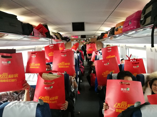 1月18日,奧園愛心高鐵專列正式啟程。活動現場,受助者在高鐵站參加簡短而溫馨的送站儀式,奧園為乘客送上了“福字大禮包”。在全體人員合影留念后,滿懷喜悅的乘客踏上了返鄉的旅程,列車于當天11:20準時發車。