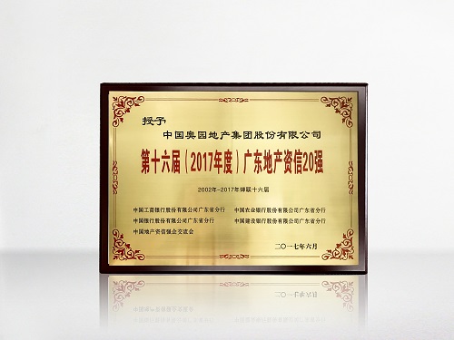 “第十六屆(2017年度)廣東地產(chǎn)資信20強(qiáng)”榮譽(yù)獎(jiǎng)牌