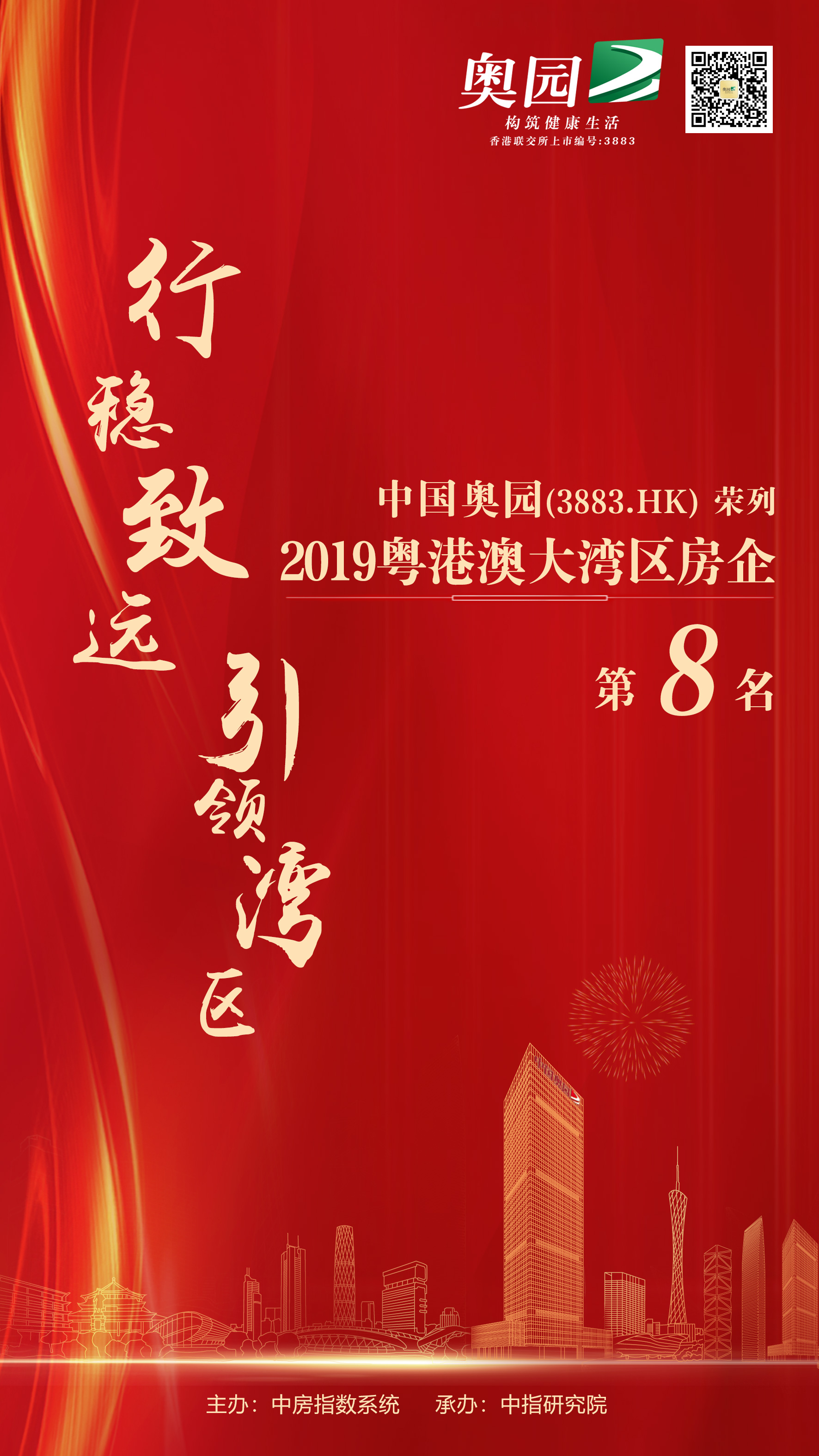 中國奧園憑借在粵港澳大灣區房地產市場的業績表現榮獲“2019粵港澳大灣區房地產10強企業”第8名。