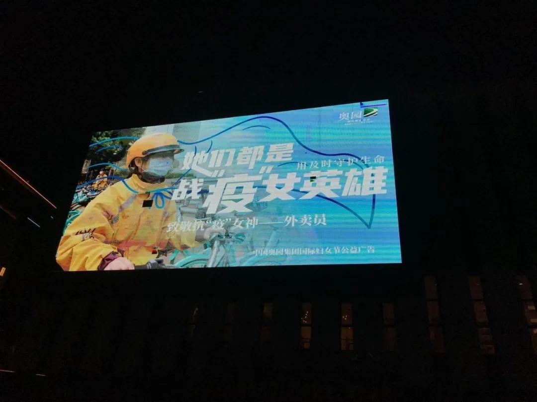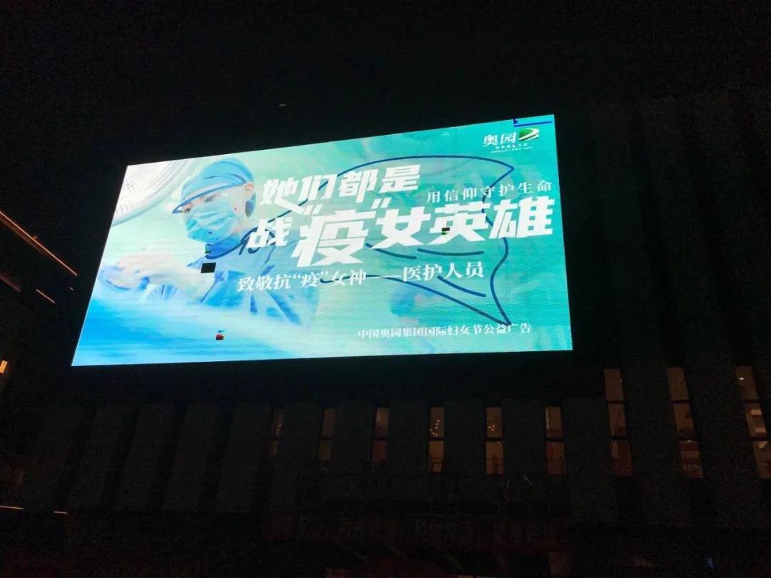 在國際婦女節(jié)來臨之際,3月6日,中國奧園聯(lián)動遍布在全國各地的21個項目樓盤及商業(yè)物業(yè)項目的35塊LED大屏,展現(xiàn)她們美麗堅韌的身影,致敬戰(zhàn)“疫”前線的女性,并為社會各界齊心抗疫加油打氣。