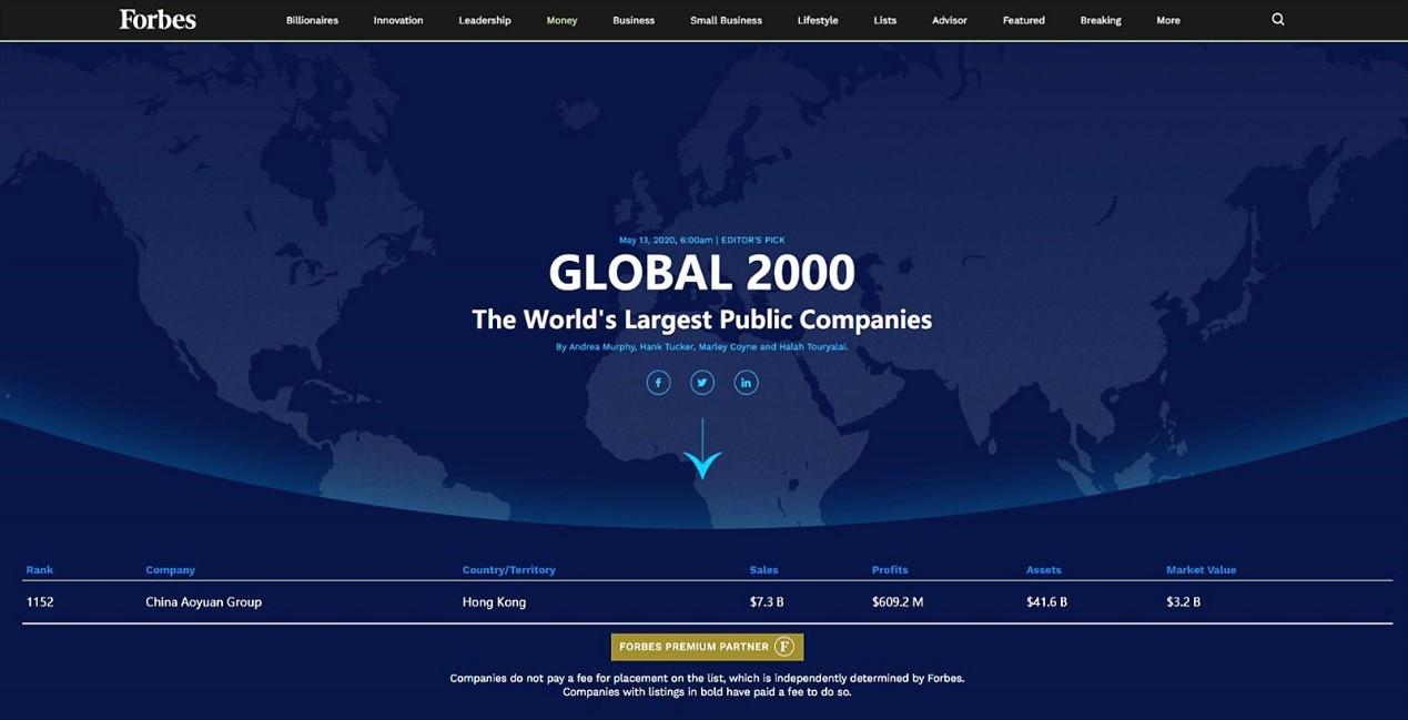 5月13日,全球最具影響力的權威商業雜志之一——《福布斯》發布2020年上市公司2000強榜單。其中,中國奧園(3883.HK)以73億美元銷售額、6.092億美元利潤、416億美元總資產和32億美元市值首次躋身榜單,位列1152名。