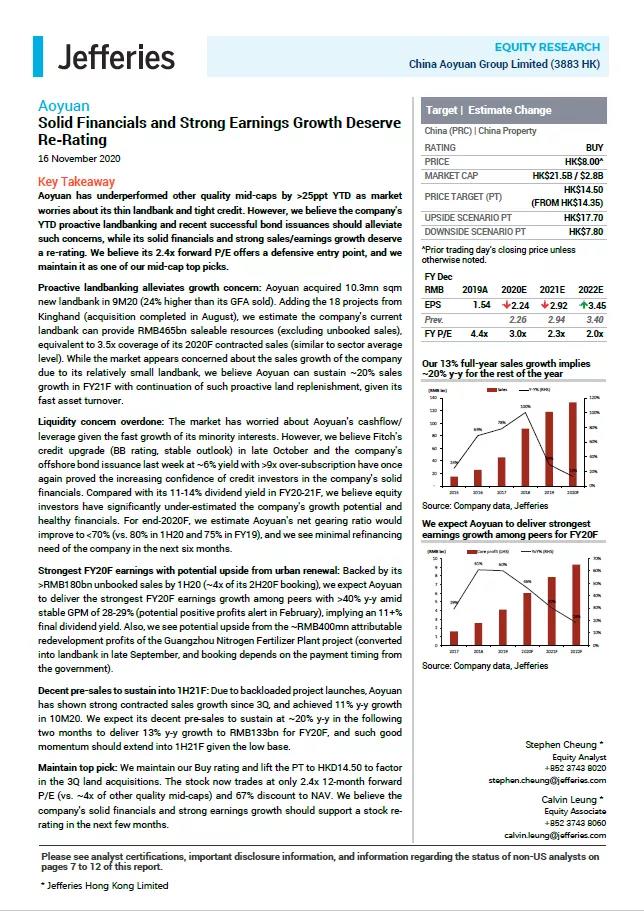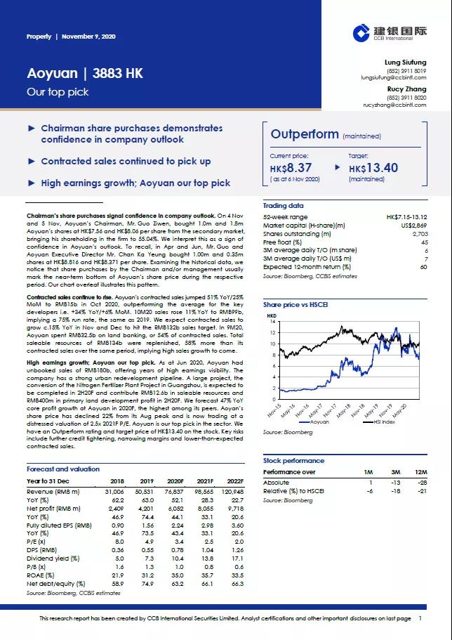 隨著下半年推盤提速,奧園合同銷售自三季度起集中發力,2020年前10個月合同銷售同比增長11%至985.1億元,已完成全年目標約75%。富瑞金融、星展銀行、銀河-聯昌證券、建銀國際均認為,奧園全年銷售目標完成無懸念。