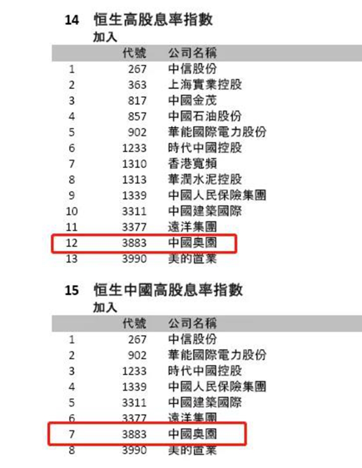 中國奧園獲納入恒生高股息率指數及恒生中國高股息率指數