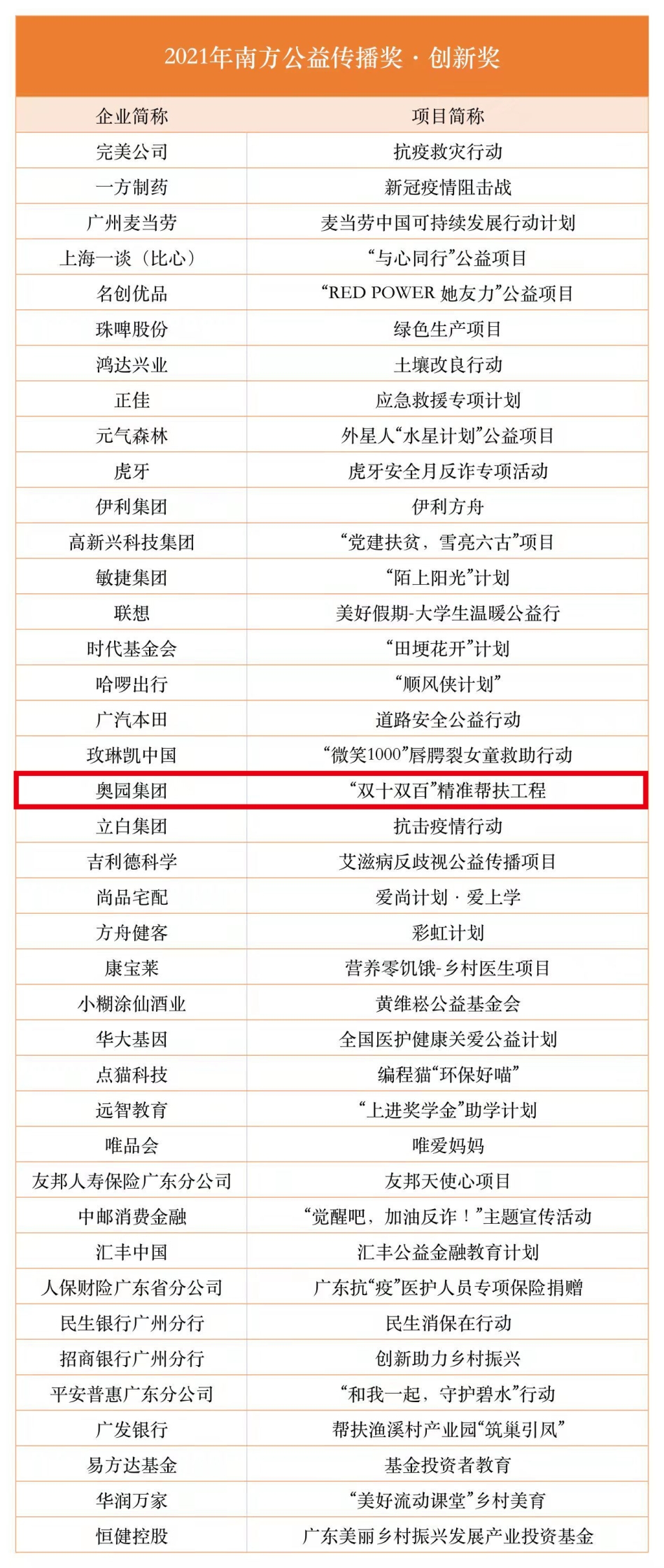 12月16日,由南方報(bào)業(yè)傳媒集團(tuán)、廣東省商務(wù)廳主辦,南方日?qǐng)?bào)、南方+承辦的“入世20周年企業(yè)家高峰對(duì)話暨南方致敬2021年度盛典”正式舉行,會(huì)上揭曉2021南方公益?zhèn)鞑オ?jiǎng)榜單,中國(guó)奧園連續(xù)兩年登榜。奧園積極開展的“雙十雙百”精準(zhǔn)幫扶工程榮膺“南方公益?zhèn)鞑オ?jiǎng)·創(chuàng)新獎(jiǎng)”。