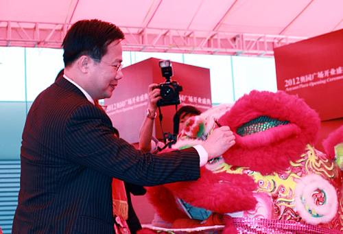 上午11:30,番禺區政府領導與奧園集團董事局主席郭梓文及商家一道進行了開業剪彩儀式。區委常委、常務副區長陳德俊代表區委和區政府在開業典禮上作了致辭,陳常委表示奧園廣場的開業,結束了番禺無大型現代化購物中心的歷史,起到了推動廣州南部商貿服務業升級換代的重要作用,必將進一步推動番禺區及廣州南部城區發展繁榮。奧園集團總裁郭梓寧先生在致辭中表示:奧園廣場高起點、高定位,著力打造國際一流的大型時尚購物中心,有信心把奧園廣場辦出檔次、辦出特色,成為番禺乃至珠三角商業項目的一顆明珠,成為番禺市民購物休閑的首選之地,成為番禺人民引以自豪的一道亮麗的風景線。隨后,區委、區政府等領導在奧園集團負責人的陪同下,參觀了新開業的奧園廣場,與廣大市民共同感受其時尚魅力。