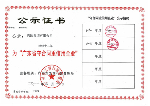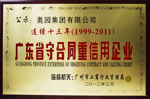 (2012年6月12日——廣州)中國奧園地產集團再次榮獲由廣州市工商行政管理局、廣州企業信用促進會評定頒發的“廣東省守合同重信用企業”榮譽稱號,而這是奧園集團連續十三年(1999-2011年度)獲此殊榮。