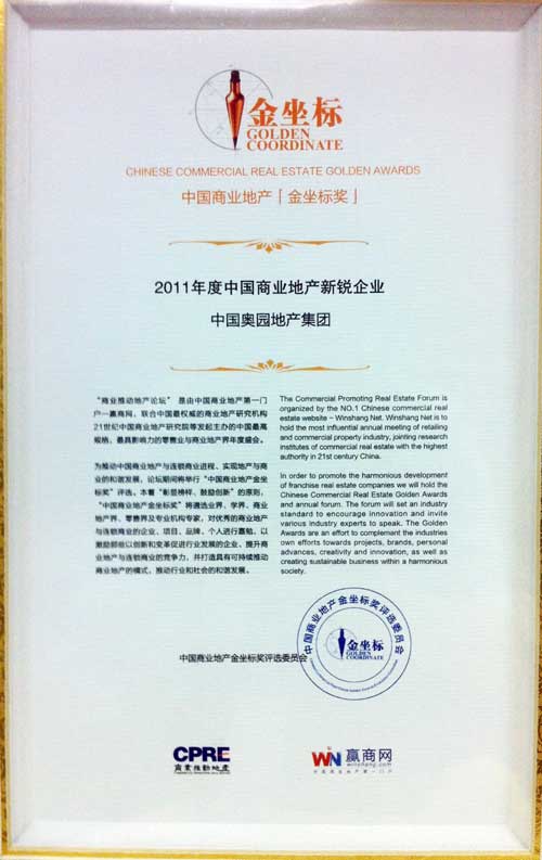 中國奧園地產(chǎn)集團(tuán)榮獲“中國商業(yè)地產(chǎn)新銳企業(yè)”殊榮