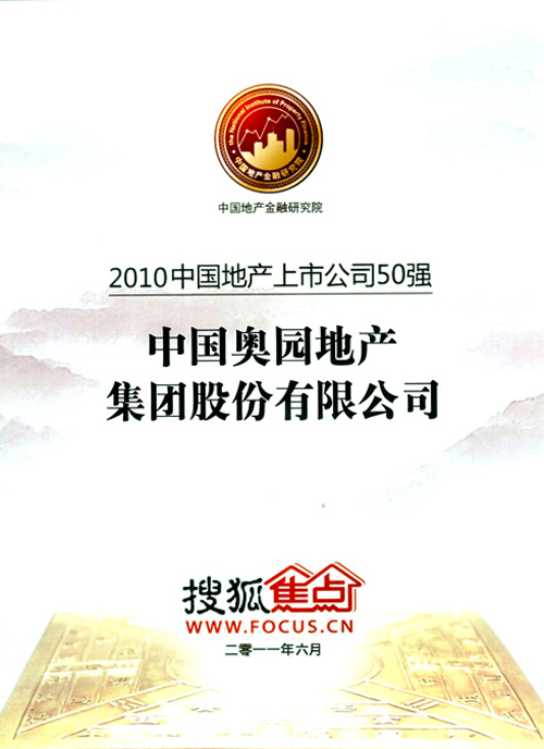 中國奧園地產(chǎn)集團(tuán)榮膺“2010中國地產(chǎn)上市公司50強(qiáng)”