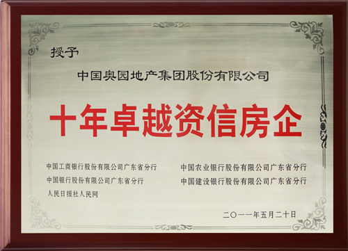 在5月20日廣州舉行的“和諧·共贏·發展”地產金融峰會暨“第十屆(2011年度)廣東地產資信20強”頒獎典禮上,奧園一舉摘得“廣東地產資信20強”和“十年卓越資信房企”兩項殊榮。該榮譽由中國工商銀行等四大國有商業銀行廣東省分行聯合中央權威媒體綜合評定,共同頒發。