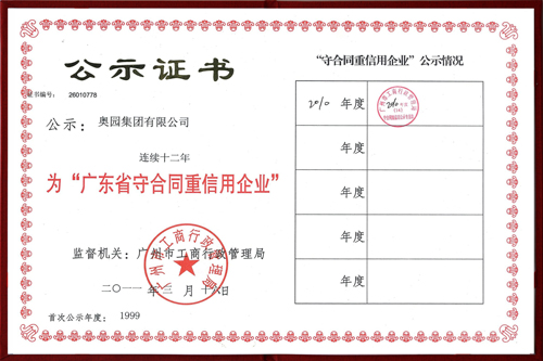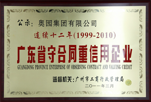 (2011年3月18日——廣州)中國奧園地產集團榮獲由廣州市工商行政管理局、廣州市合同管理協會公示頒發的連續十二年“廣東省守合同重信用”企業榮譽稱號。