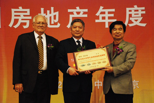 (2010年12月11日——沈陽)聯(lián)合國人居署全球最佳范例專家委員會副主任委員、北卡羅萊納大學政府管理學院經(jīng)濟學博士愛德華·思格魯格斯教授、聯(lián)合國工業(yè)發(fā)展組織中國投資于技術促進處綠色產業(yè)專家委員會委員、中國生態(tài)經(jīng)濟學會副會長、國務院突出貢獻津貼專家王松霈先生、中國房地產總評榜組委會秘書長王棟先生一行駛來到沈陽奧園·國際城,他們代表聯(lián)合國人居署全球最佳范例專家委員會和中國地產總評榜組委會向奧園·國際城頒發(fā)“聯(lián)合國人居署生態(tài)科技最佳范例獎”,奧園·國際城總經(jīng)理陶力群先生代表奧園接受兩位專家頒發(fā)的“聯(lián)合國人居署生態(tài)科技最佳范例獎”獎牌。