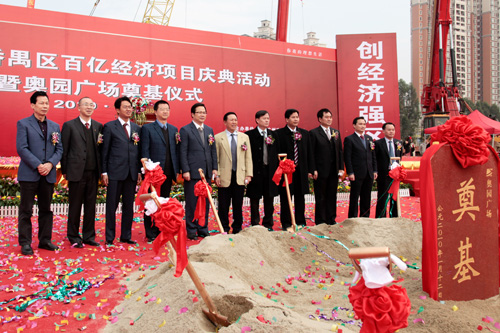 (2010年01月12日——廣州)2010年1月12日,大型綜合性商業中心奧園廣場工地上,彩旗招展,鑼鼓喧天,大紅拱門高高樹立,慶賀花籃擺放整齊,處處透露著喜慶的氛圍。作為“番禺區百億經濟慶典活動”分會場,奧園廣場奠基盛典隆重舉行。番禺區領導歐康壽、戴永昌、龔漢坤、周志、夏紹國等和番禺區有關部門負責人,中國奧園地產集團領導郭梓文、郭梓寧等以及施工單位、設計單位、金融機構等合作伙伴的代表共200多人出席了此次盛會。