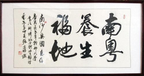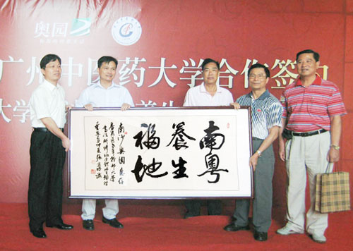 陳松有先生贊嘆南沙奧園作為“生命加油站,健康維護營”的養生地產名不虛傳,向郭梓寧先生贈送了“南粵養生福地”牌匾,這遒勁老道的六個大字出自番禺老干部大學詩書畫協會會長、一級書法家張富明的手筆。郭梓寧先生也向陳松有先生回贈了中國奧園地產集團的精美畫冊。
