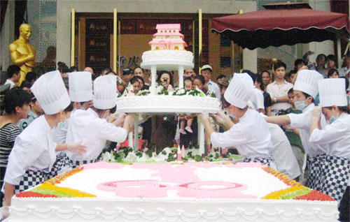 整個(gè)活動(dòng)的高潮,則是“千人大蛋糕”的登場(chǎng)。由七八個(gè)人合力相抬的4、5米長(zhǎng)一塊方形蛋糕作為底座,蛋糕上書寫著“奧園康城禮獻(xiàn)祖國(guó)60華誕”幾個(gè)大字,再加上2塊圓形蛋糕,在桌子上組合成了三層蛋糕塔,塔頂上是天安門城樓。然后由百名共和國(guó)的同齡人點(diǎn)燃了蠟燭,齊聲唱起贊歌,歌頌偉大的祖國(guó)。隨后開吃的千人國(guó)慶宴達(dá)到100桌的壯觀規(guī)模,座無虛席,共同享受美味。