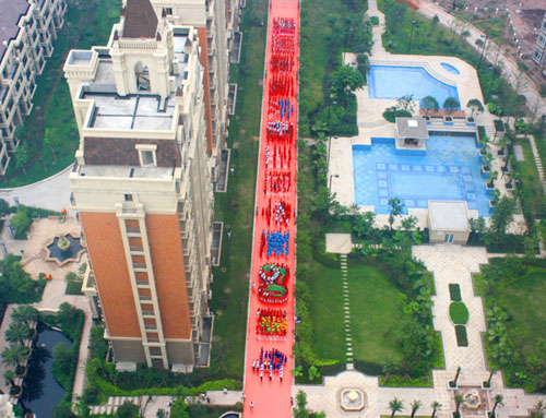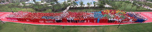 下午2:00,小區(qū)內(nèi)主干道出現(xiàn)了一大奇觀。1000名參賽者排站成一行百米長(zhǎng)的賀詞:奧園康城慶祝祖國(guó)華誕60周年!參賽者們用最獨(dú)特的方式深情表達(dá)了自己對(duì)祖國(guó)母親的無限崇敬及美好祝愿。