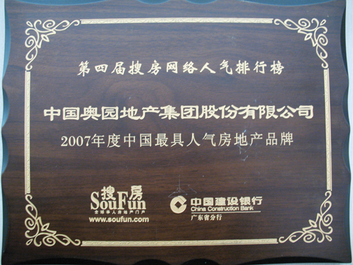 (2008年1月21日——廣州)中國奧園地產集團地產集團股份有限公司又獲殊榮,在第四屆搜房網絡人氣排行榜上榮獲“2007年度中國最具人氣房地產品牌”稱號。