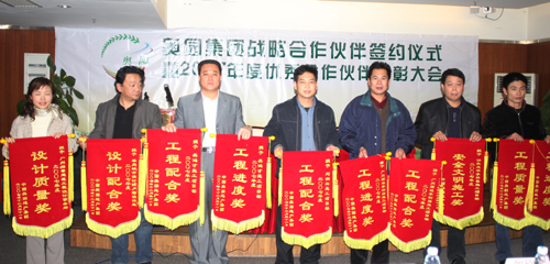 奧園集團副總裁、CTO胡大為先生代表奧園地產集團宣布2007年度優秀合作伙伴的表彰決定,對過去一年表現出色的設計、施工等合作單位分別授予最佳設計服務獎、最佳工程質量獎、最佳工程進度獎、安全文明施工獎獎旗。合作伙伴紛紛表示要與奧園地產集團在地產業務上密切合作,一如既往,同甘苦、共進退、同成長。