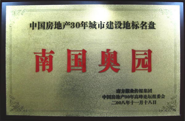 (2008年12月12日——廣州)中國(guó)奧園地產(chǎn)集團(tuán)股份有限公司(股票編號(hào):3883)在南方報(bào)業(yè)傳媒集團(tuán)、中國(guó)房地產(chǎn)30年高峰論壇組委會(huì)主辦的中國(guó)房地產(chǎn)30年頒獎(jiǎng)盛典上榮獲“中國(guó)房地產(chǎn)30年城市建設(shè)成就獎(jiǎng)”榮譽(yù),與此同時(shí),集團(tuán)董事局主席郭梓文先生亦榮獲“中國(guó)房地產(chǎn)30年十大杰出貢獻(xiàn)人物獎(jiǎng)”,集團(tuán)旗下的南國(guó)奧園榮獲“中國(guó)房地產(chǎn)30年城市建設(shè)地標(biāo)名盤(pán)”稱號(hào)。