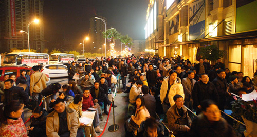 自11月以來(lái),重慶樓市陷入冷淡,直至奧園康城2期堅(jiān)果社區(qū)的火爆熱銷才始破僵局。原本準(zhǔn)備于12月13日開(kāi)盤(pán)的全新奧園康城2期堅(jiān)果社區(qū),自從12月9日“37平方米-104平方米歲末大回饋,3350-3950元/平方米,不同樓層分段一口價(jià),先到先得”的廣告信息一“出街”,立即引起了業(yè)界、媒體、消費(fèi)者的強(qiáng)烈反響與驚呼,紛紛奔走相告。9日、10日、11日三天整個(gè)奧園康城銷售中心內(nèi)被看房者圍得水泄不通??蛻衾鄯e達(dá)1000多組,由于是“先到先得”選房,很多客戶由于怕選不到房提前兩天就已經(jīng)開(kāi)始排隊(duì)了,11日下午5點(diǎn)多便有客戶開(kāi)始排隊(duì),晚上8點(diǎn)自發(fā)排隊(duì)客戶人數(shù)急增至500組,12點(diǎn)即達(dá)到1000多組,并還在不斷遞增之中,由于排隊(duì)客戶過(guò)多,堅(jiān)果社區(qū)提前至12日盛大開(kāi)盤(pán)。