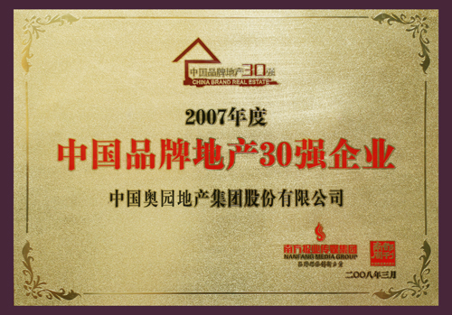 (2008年3月——廣州)中國奧園地產集團股份有限公司(香港股票代號:3883)在由南方報業傳媒集團主辦、《南都周刊》承辦的首屆“中國品牌地產30強”評選中入選為中國品牌地產30強。