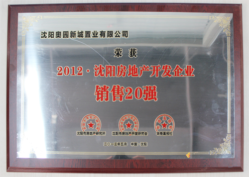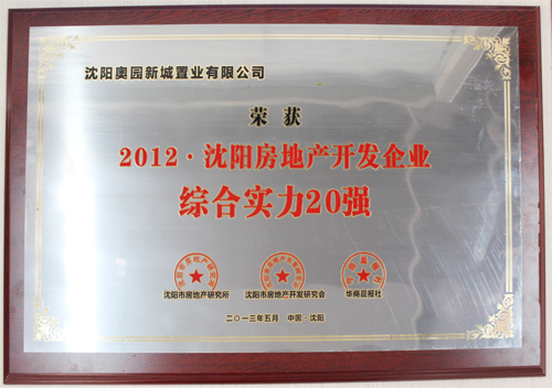 沈陽奧園榮膺“2012年沈陽房地產開發企業綜合實力20強”稱號