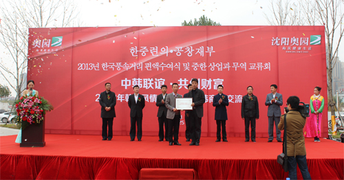(2013年10月28日——沈陽)沈陽奧園韓國風情街授牌儀式暨2013中韓商貿交流會先后分別在沈陽奧園會展廣場和國展酒店舉行。沈陽市蘇家屯區區長蹇騫,集團總裁助理兼沈陽片區公司總經理李援非,沈陽片區公司總經理助理黃繼宗、鄂丹玲,以及中韓協會企業代表、各媒體代表出席授牌儀式。