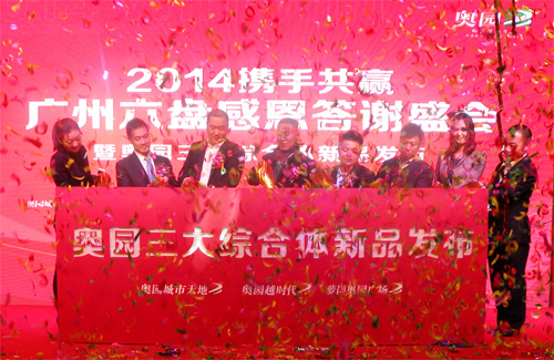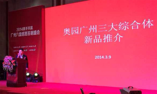 (2014年3月9日——廣州)“廣州奧園六盤感恩答謝盛會暨奧園三大綜合體新品發布”活動在奧園高爾夫酒店隆重舉行,主辦方奧園集團廣州區域公司邀約了中山大學的博士生導師林江教授發表關于“2014年房地產市場分析及預測”的主題演講,同時啟動“奧園城市天地、奧園越時代、蘿崗奧園廣場”三大綜合體的新品發布,當天現場吸引了600多位業主、客戶前來參加。