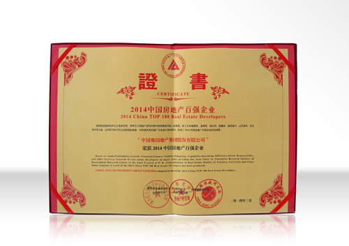 “2014中國房地產(chǎn)百強(qiáng)企業(yè)”證書