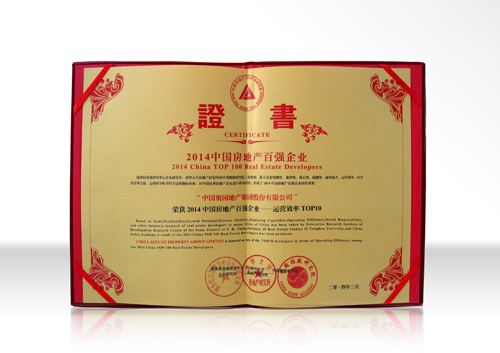 “2014中國房地產(chǎn)百強(qiáng)企業(yè)——運(yùn)營效率TOP”證書