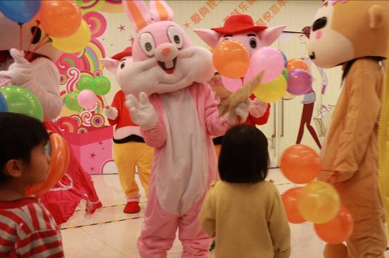 喵星人奇幻巡游中萌物人偶和小朋友游戲