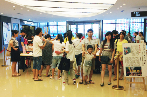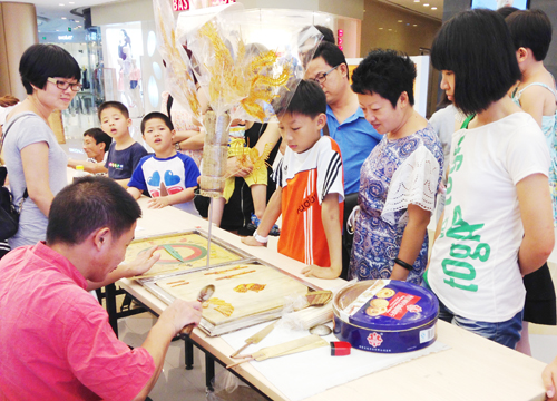 十個項目中,又數畫糖畫和米上刻字最受歡迎。糖畫的糖料一般是在紅、白糖中加上少許飴糖放在爐子上用溫火熬制,熬到可以牽絲時即可以用來澆鑄造型。在繪制造型時,由藝人用小湯勺舀起溶化的糖汁,在石板上飛快地來回澆鑄,畫出造型。負責制作糖畫的林老師還是業內小有名氣的專家,活動當天,廣東電視臺對林老師還進行了專門采訪。我們平時吃的糖畫都是2D平面造型,可是林老師有一項絕活——3D造型,草蜢、鳳凰、花朵……只要你想得到的,林老師就可以做出來。“糖畫載滿我們兒時的回憶,今晚注定失眠了。”活動結束后,網友通過微博向奧園廣場表達游園市集帶給她的感動。