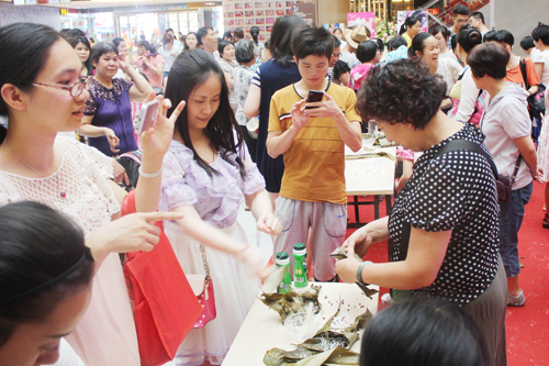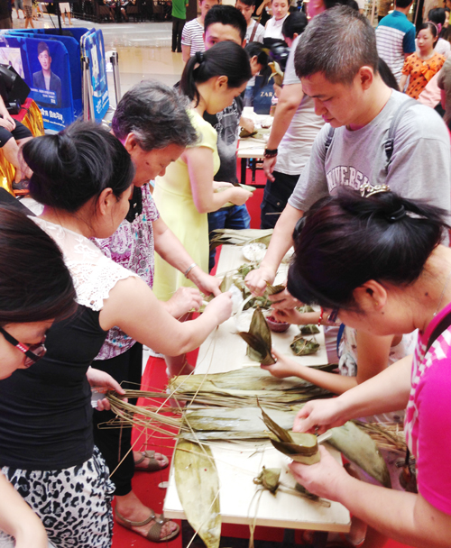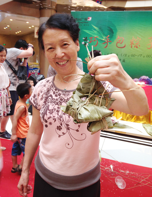 當天舉辦的巧手包粽子大賽頗受歡迎,尤其是女性顧客反響最為熱烈。當天分三個時段共舉辦了三場巧手包粽子大賽,每場都人氣爆棚。隨著主持人宣布“開始”,參賽顧客便使出看家本領,手忙腳亂起來,因為只要包成功的粽子,都可以免費帶回家。阿姨們果然是“巧手”,僅10分鐘,就可以包7、8個粽子,雖然大叔們則有些手生,花了十分鐘只包了一個粽子,但是個頭還真挺大!