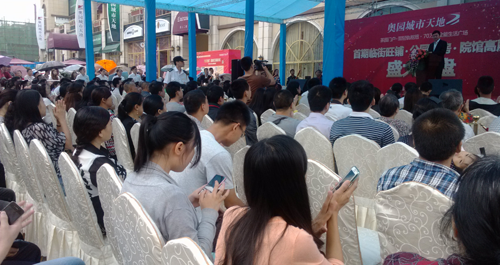 開盤當天早上8點,重慶奧園城市天地廣場及道路兩旁早已排起了車龍,從各地冒雨趕來選房的客戶已早早簽到登記,并陸續進入選房區等候。9點30分,開盤盛典正式開始,全場入場客戶有上千余名,到處人頭攢動,景象甚是壯觀。在選房過程中,場面雖異常火爆,卻井然有序、有條不紊,每個工作人員都忙得不可開交,現場客戶也翹首以待。據相關人士透露,此次首期開出的輕軌臨街商鋪、中心院館高層、城央墅公園洋房受到購房者的瘋搶,更有客戶一口氣買入二十余間商鋪。