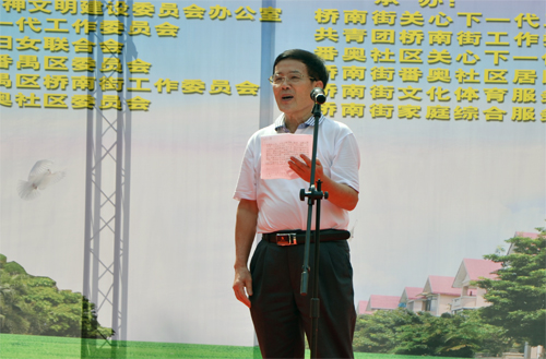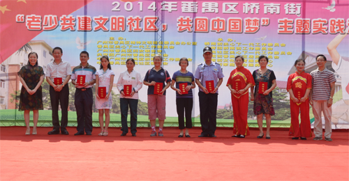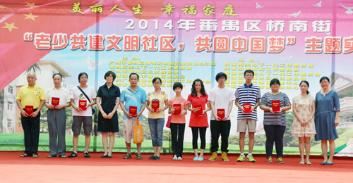 (2014年7月15日—廣州)7月15日上午,“老少共建文明社區(qū),共圓中國(guó)夢(mèng)”主題實(shí)踐活動(dòng)在番奧社區(qū)文化長(zhǎng)廊舉行,此次活動(dòng)由番奧社區(qū)黨委與區(qū)文明辦、區(qū)關(guān)工委、區(qū)婦聯(lián)、團(tuán)區(qū)委、橋南街黨工委聯(lián)合主辦。番禺區(qū)委常委、宣傳部部長(zhǎng)徐柳,區(qū)關(guān)工委名譽(yù)主任越良釗、莫燦章、謝權(quán)森、葉才,執(zhí)行主任陳松有,副主任郭錫森、陳又南,區(qū)委老干部局局長(zhǎng)黃錦坤、團(tuán)區(qū)委副書(shū)記吳錦瑩等領(lǐng)導(dǎo)出席了活動(dòng)。番奧社區(qū)居民代表220多人參加了此次活動(dòng)。
