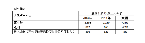 2014年上半年,本公司繼續(xù)取得理想的經(jīng)營(yíng)業(yè)績(jī),營(yíng)業(yè)額為約人民幣26.58億元,同比增加24%。毛利增長(zhǎng)22%至人民幣8.12億元,毛利率約30.5%,與去年同期基本持平。凈利潤(rùn)為約人民幣3.20億元,核心純利(不包括除稅后投資物業(yè)公平值收益)為約人民幣3.06億元。
