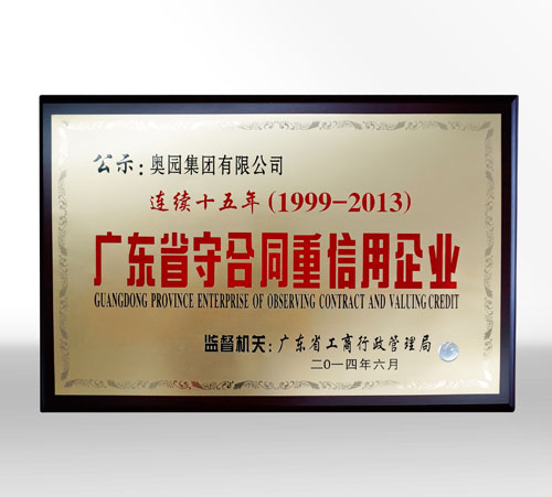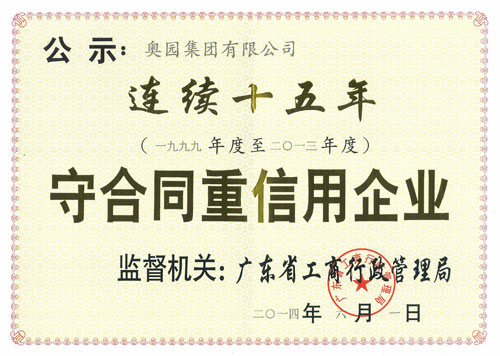 奧團集團連續十五年榮獲“廣東省守合同重信用企業”,充分體現了“高效、誠信、責任”的企業精神,體現奧園重視合同管理和履行企業責任,不斷提升企業品牌知名度與美譽度,受到了政府及社會各界的一致好評和高度認可。