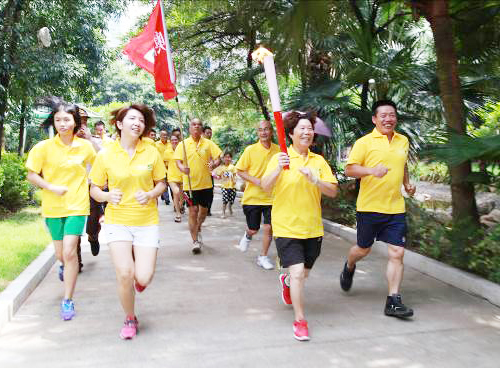 啟動儀式后,是運動會火炬接力跑,由業主代表護航、火炬手和旗手參加,沿各自小區環跑,傳遞“奧園圣火”。通過時間差,圣火沿著南國奧園、廣州奧園、番禺奧園、南沙奧園、沈陽奧園等社區傳遞,全國各地奧園業主共同分享運動精神,傳播健康生活的種子。