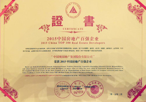 (2015年3月27日——北京)3月27日,在北京釣魚臺國賓館召開的“2015中國房地產百強企業研究成果發布會暨第十二屆中國房地產百強企業家峰會”,奧園榮獲“2015中國房地產百強企業”綜合實力第30名、“2015中國房地產百強企業運營效率TOP10”第5名,各項排名在2014年基礎上都獲得提升!