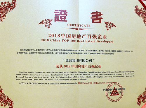 奧園榮膺“2018年中國房地產百強企業第27名”等多項殊榮