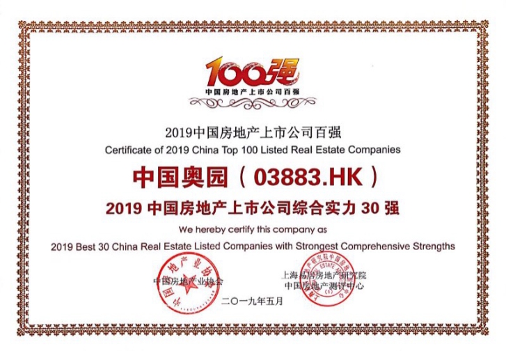 中國(guó)奧園榮獲“2019中國(guó)房地產(chǎn)上市公司綜合實(shí)力30強(qiáng)”
